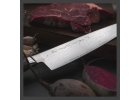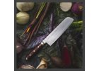 Menší varianta santoku, ideální na krájení masa, zeleniny a drobnějších surovin. Délka čepele: 125 mm Japonský kuchyňský nůž z oceli MOVAX. Vyrobeno v Japonsku